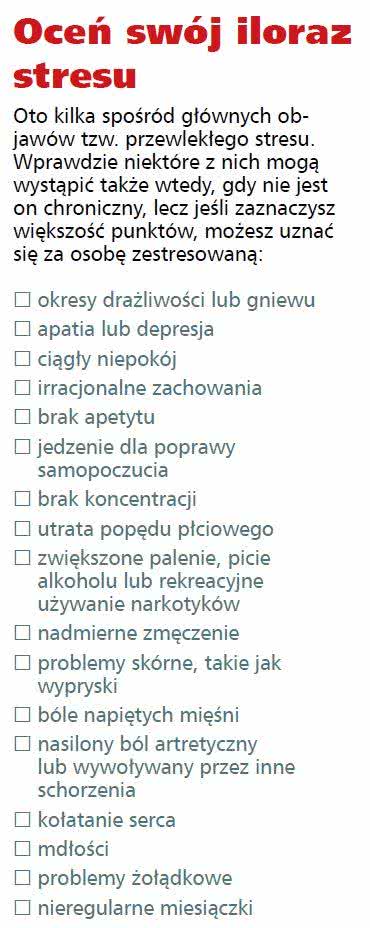 Czasami rzeczywiście wystarczy zmiana sytuacji - np. przeprowadzka, jeżeli mamy wyjątkowo dokuczliwych sąsiadów - często jednak stres jest skutkiem mnóstwa drobnych codziennych zdarzeń, z których każde jest małym, lecz irytującym czynnikiem stresowym4. Sugeruje to, że kumulujące się napięcie może stać się również nawykową odpowiedzią chemiczną organizmu - i ten właśnie nawyk wymaga zmiany.