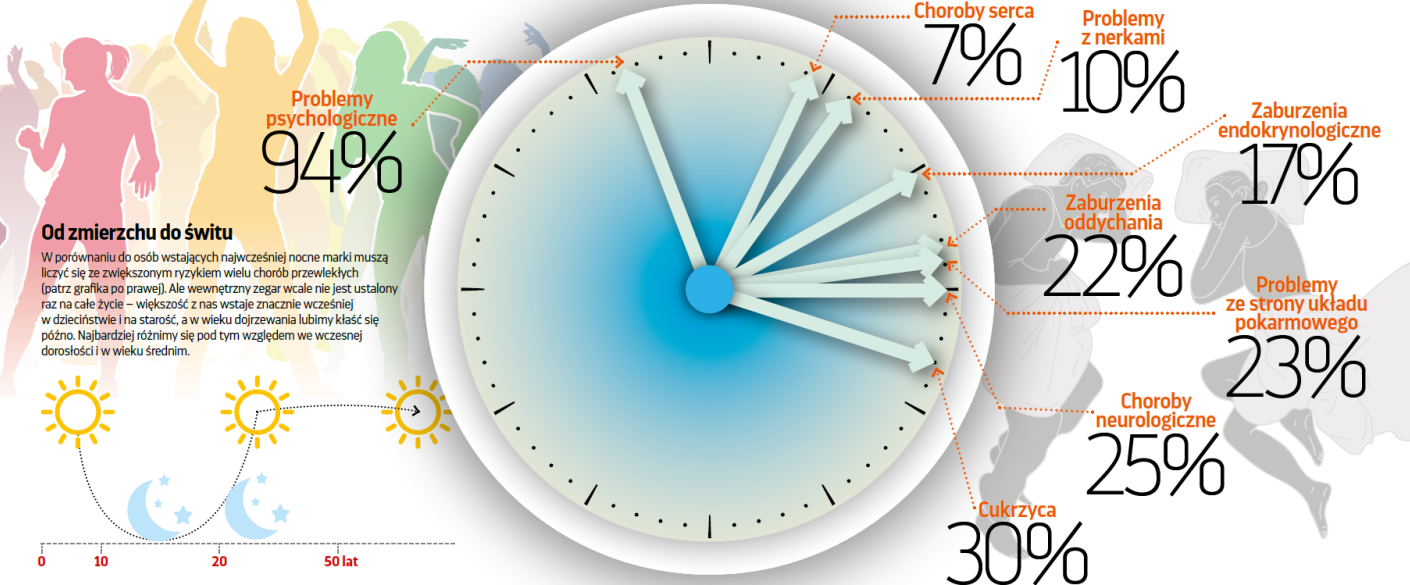 W porównaniu do osób wstających najwcześniej nocne marki muszą liczyć się ze zwiększonym ryzykiem wielu chorób przewlekłych. Ale wewnętrzny zegar wcale nie jest ustalony raz na całe życie - większość z nas wstaje znacznie wcześniej w dzieciństwie i na starość, a w wieku dojrzewania lubimy kłaść się późno. Najbardziej różnimy się pod tym względem we wczesnej dorosłości i w wieku średnim.
