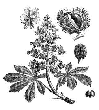Surowiec: kwiaty (Hippocastani flos), kora (H. cortex), nasiona (H. semen), owoc (H. fructus).