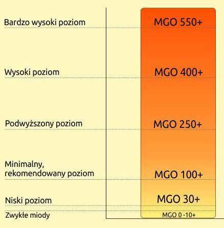 Wartość liczbowa przy symbolu MGO oznacza, jakie jest stężenie tej aktywnej substancji w przeliczeniu na kilogram produktu w konkretnym opakowaniu, np. MGO 400+, oznacza, że stężenie methylglyoxalu wynosi minimum 400 mg na kg miodu.